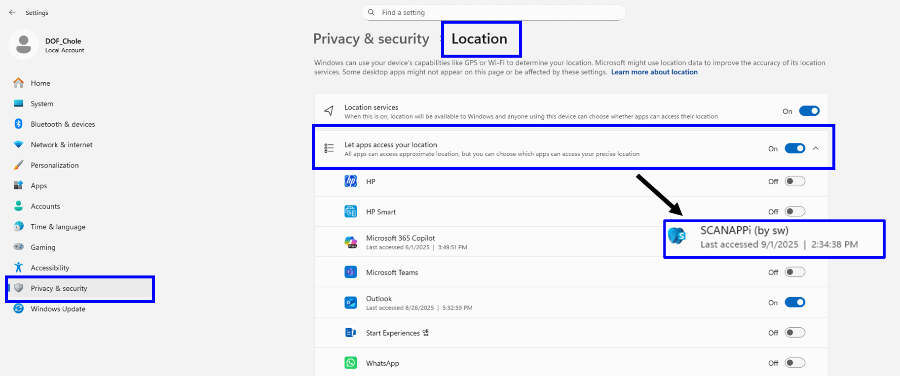 - Allow the app to access your location: Let apps access your location > Make sure ScanApp i is also enabled.