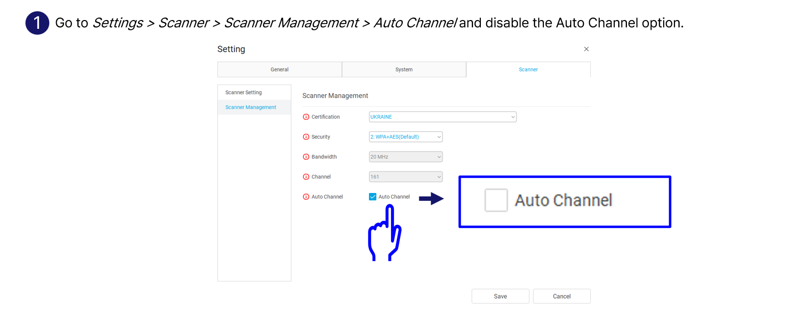If scanning is frequently interrupted and the speed is slow even when the ‘Auto Channel’ option in ScanApp i is enabled, manually change the Wi-Fi channel using the following method.