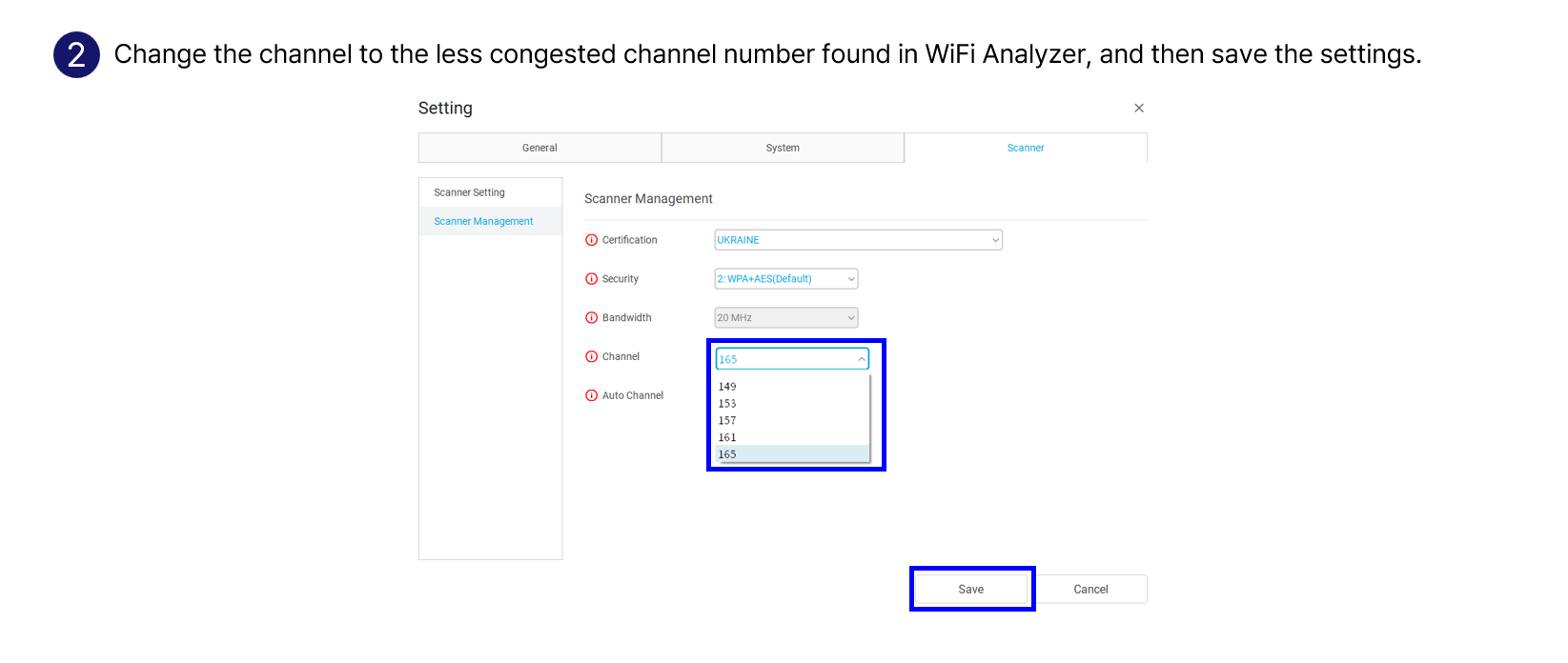 After identifying the least congested channel in ‘WiFi Analyzer’, manually change the channel in the ScanApp i settings.