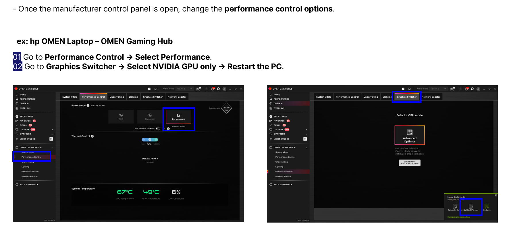 | 6. In the laptop manufacturer’s control panel, switch the performance option to High Performance mode. | 📌Check related information |