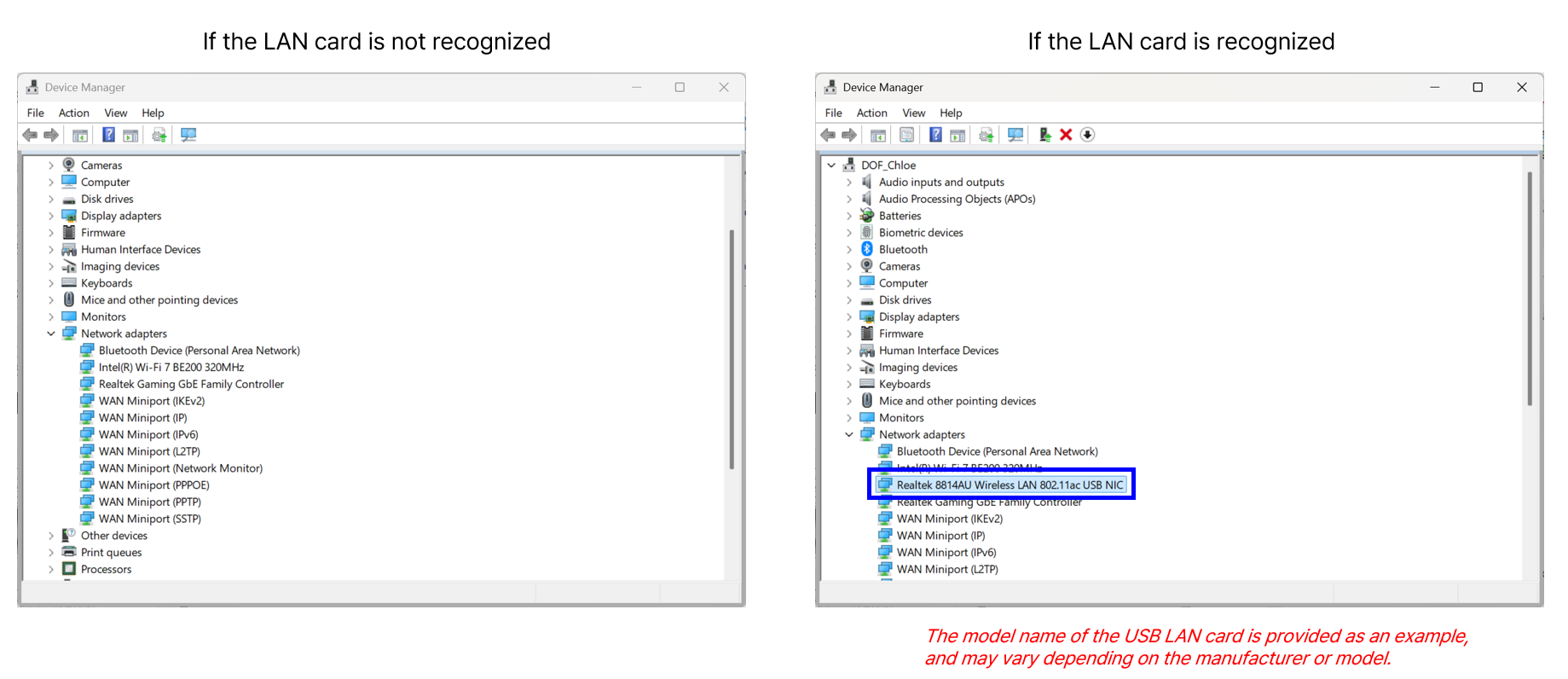 Windows Device Manager > Network adapters > Check whether the connected LAN card is recognized