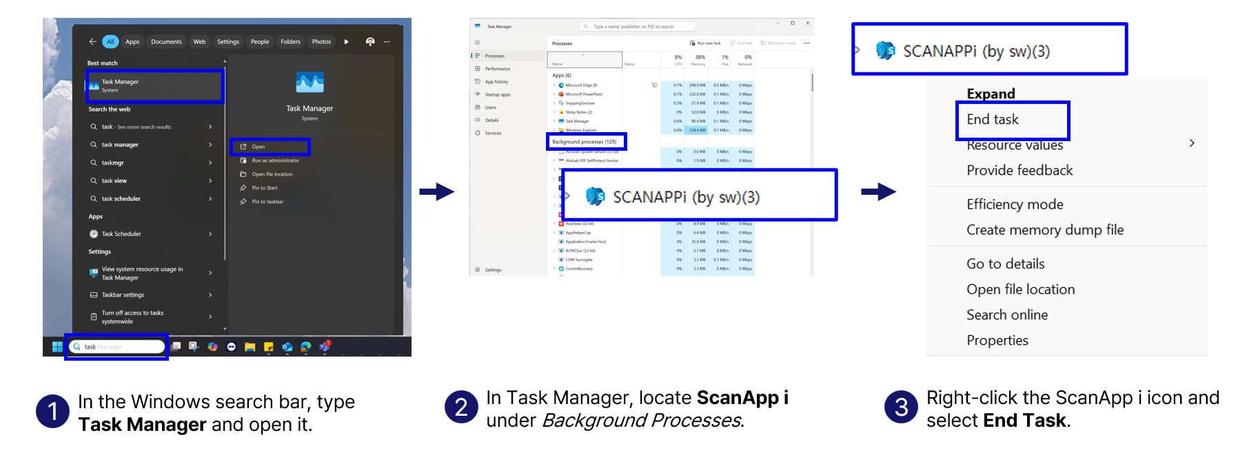 | 3. Open Task Manager and confirm whether ScanApp i is already running in the background processes. | ๐Check related information |