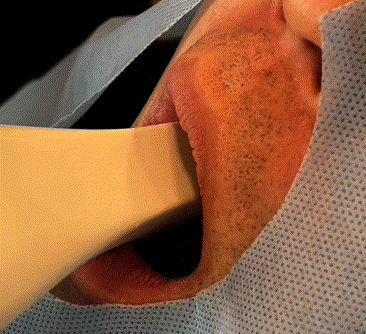 Ask the patient to open their mouth, then position the scanner on the buccal side.
