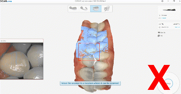 - Do not scan continuously through the anterior region. - Scanning the anterior region in a single pass may result in inaccurate occlusion data.