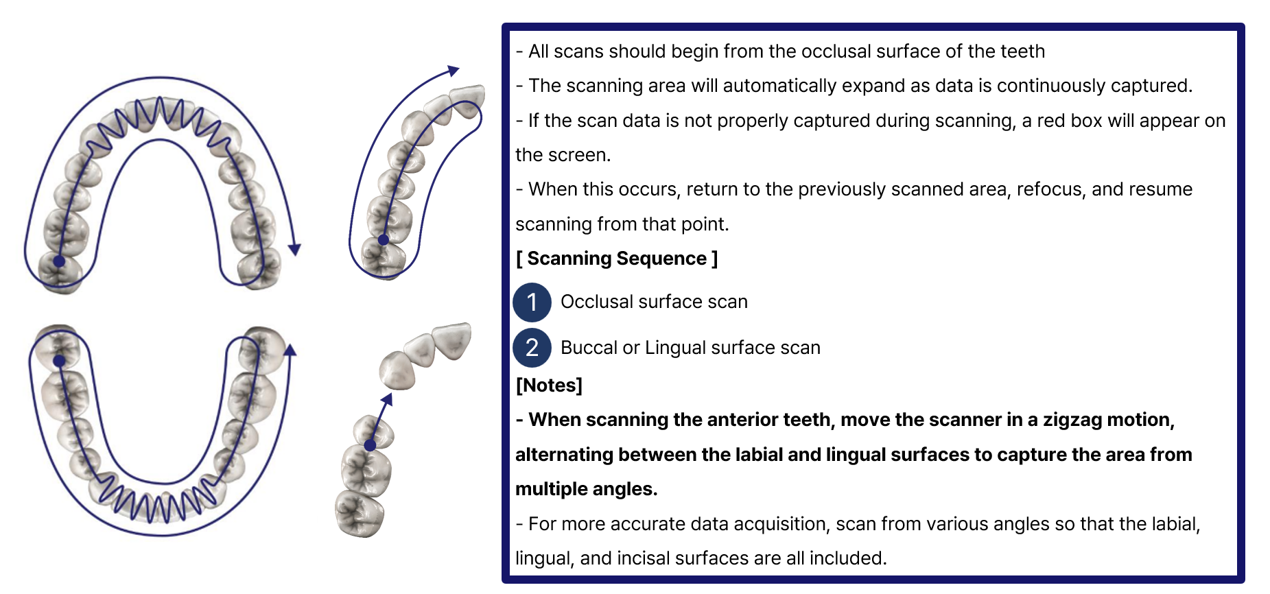 - If the scanner is positioned on the buccal side while the patient is in occlusion, unnecessary areas such as the lips or cheeks may be captured, resulting in inaccurate occlusion data.