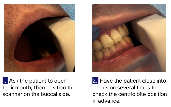 Before performing the occlusion scan, have the patient open their mouth and position the scanner on the buccal side.