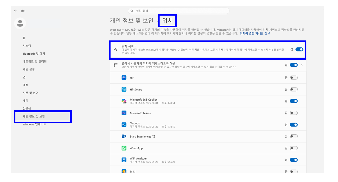 - 위치 서비스 설정 방법: 윈도우 설정 > 개인정보 및 보안 > 위치 > '위치 서비스' 활성화
