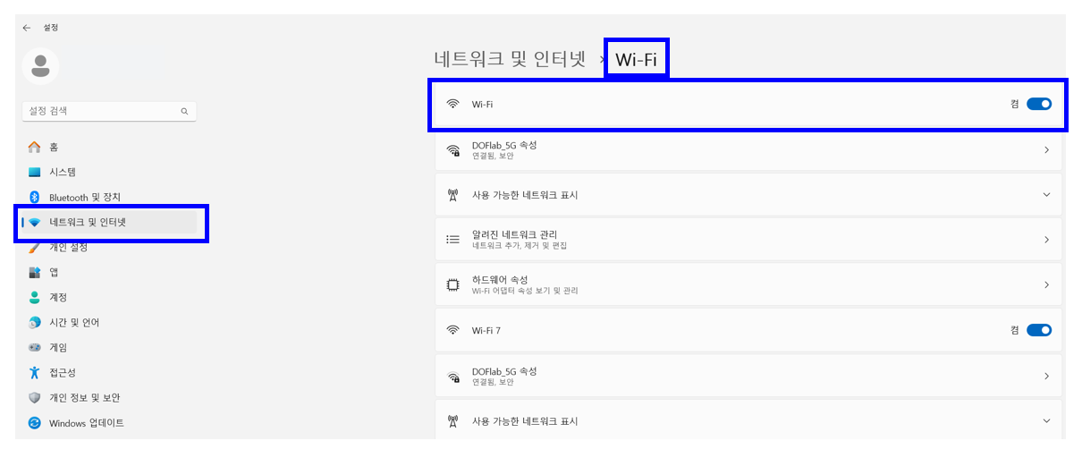 - Wi-Fi 사용 설정 방법: 윈도우 설정 > 네트워크 및 인터넷 > Wi-Fi > Wi-Fi 사용 활성화
