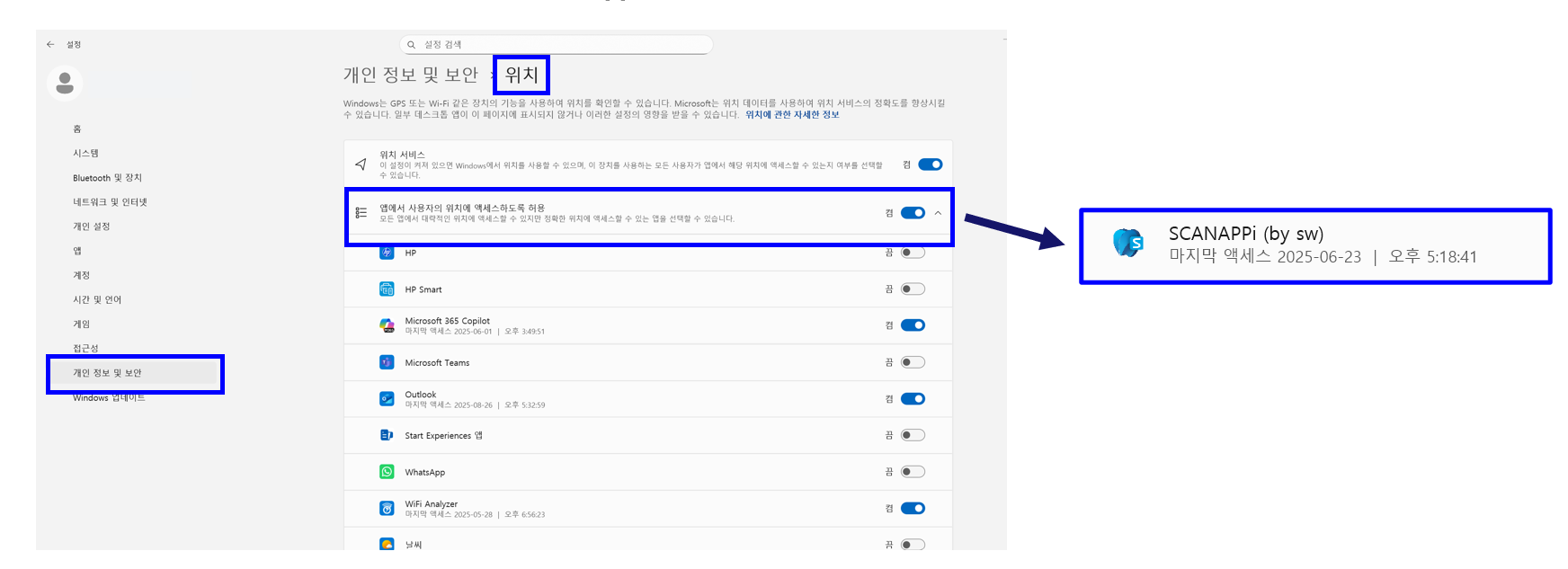 - 앱에서 사용자의 위치에 액세스 하도록 허용: 앱에서 사용자의 위치에 액세스 하도록 허용 > ScanApp i가 활성화 되어 있는지 확인합니다.