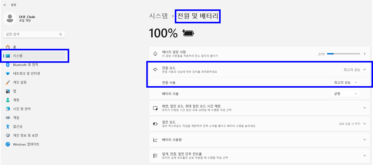 - 배터리 성능 설정 방법: 윈도우 설정 > 시스템 > 전원 및 배터리 > 전원모드 '최고의 성능' 설정