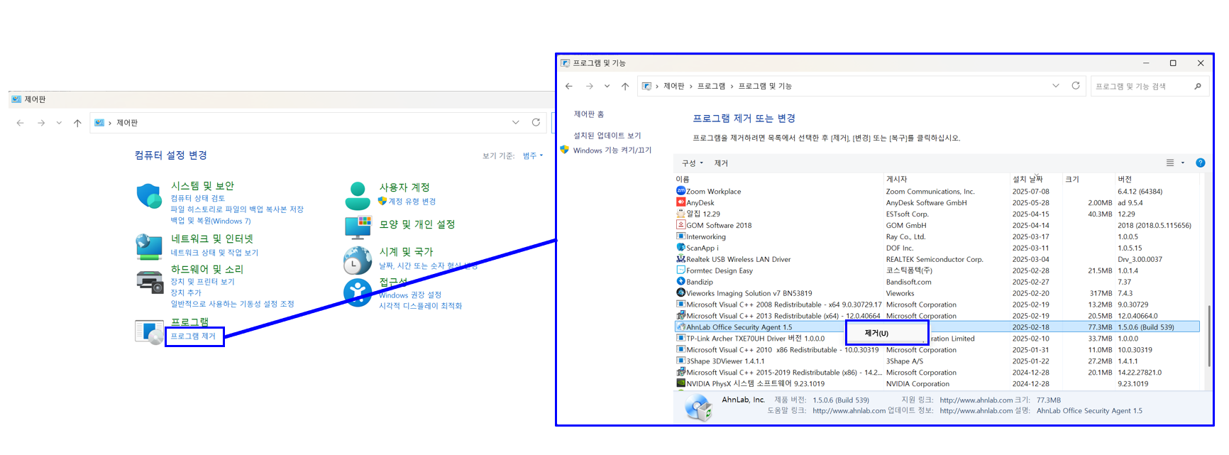 - 제어판에서 삭제 하기: 제어판 진입 > 프로그램 제거 > 해당 프로그램 선택 후 제거