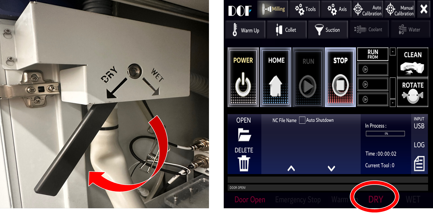 장비 하단 테이블을 열고 건/습식 레버를 건식으로 변경합니다.