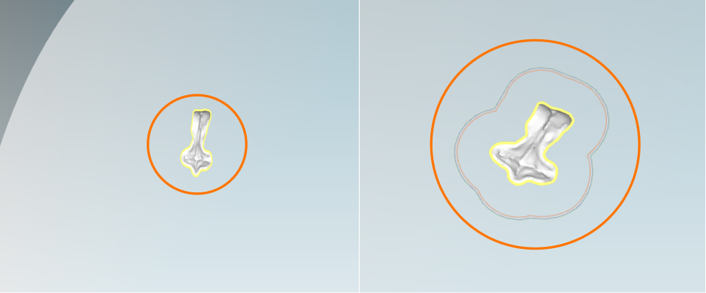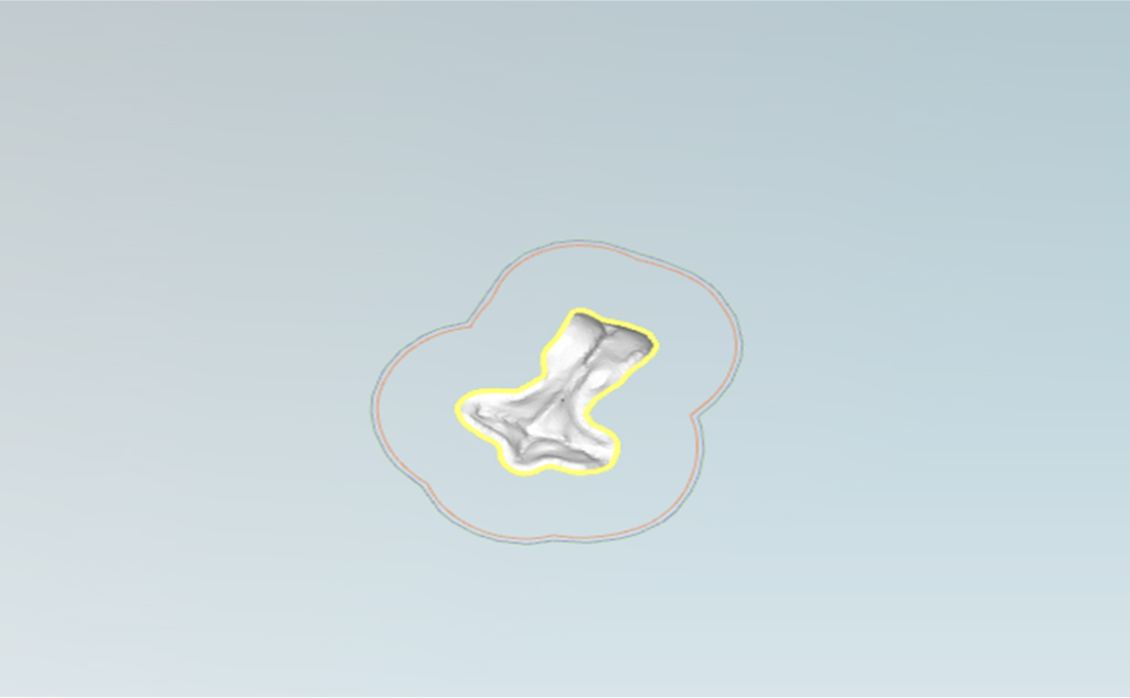 보철물 주변으로 주황색 파랑색 초록색 굴곡선을 확인합니다.