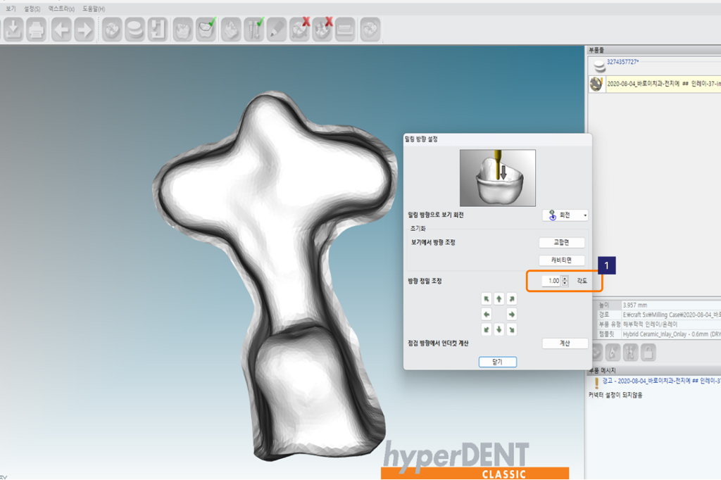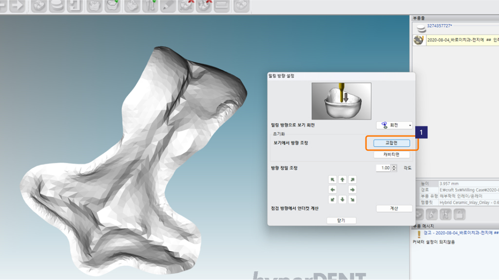 교합면 클릭하여 밀링 방향을 설정합니다.