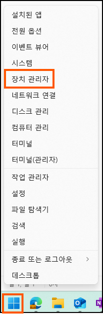 시작버튼을 오른쪽 클릭한 후 '장치 관리자'를 누릅니다.
