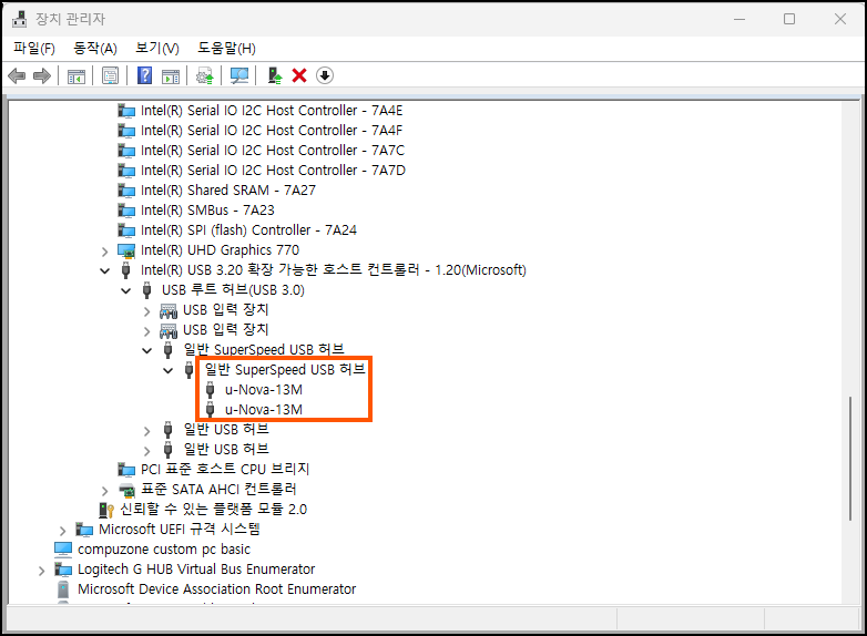 u-Nova-13M(20M)이 일반 'SuperSpeed USB 허브' 하위목록에 있는지 확인해주세요.