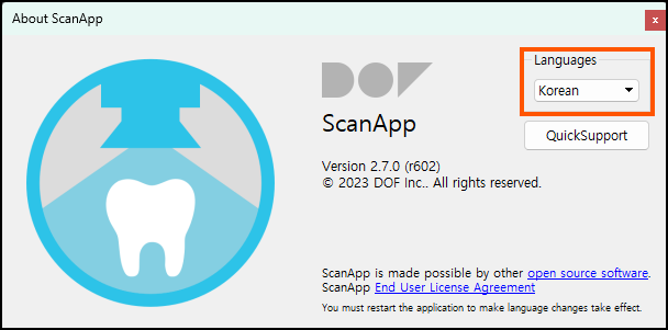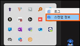 스캔앱 언어 변경 방법 DOF 신용훈 2025년 06월 13일 06:49 업데이트 시간 스캔앱을 켜신 후 오른쪽 하단에 숨겨진 아이콘을 클릭하고 스캔앱 아이콘에서 오른쪽 버튼을 눌러서 '스캔앱 정보'를 누릅니다. 표시한 부분에서 원하시는 언어를 변경할 수 있습니다. 관련 대상 언어 관련 문서 ScanApp 프로그램 설치방법