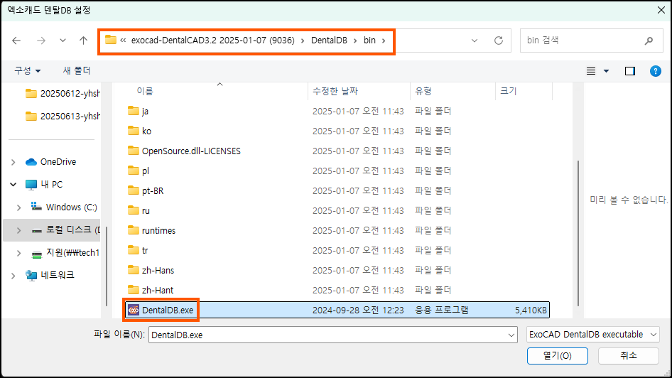 exocad가 설치된 폴더의 DentalDB.exe 파일을 선택해줍니다.