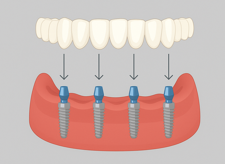 "X"는 임플란트 수를 나타내며, 보통 4개(All-on-4) 또는 6개(All-on-6)로 많이 사용합니다.