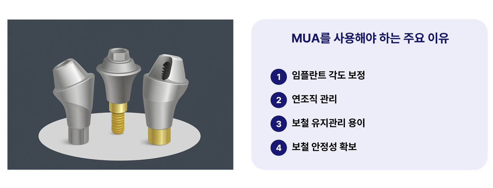 멀티 유닛 어버트먼트(MUA)는 임플란트와 최종 보철물을 연결하며, All-on-X와 같은 전악 임플란트 수복 시에 사용됩니다.