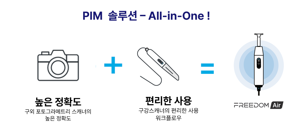 FREEDOM Air의 PIM 솔루션은 구강스캐너와 구외 포토그라메트리 스캐너의 모든 장점을 모두 결합한 All-in-One 솔루션입니다.