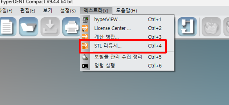 하이퍼덴트의 상단 메뉴에서 엑스트라 -> STL 리듀서 를 클릭합니다.