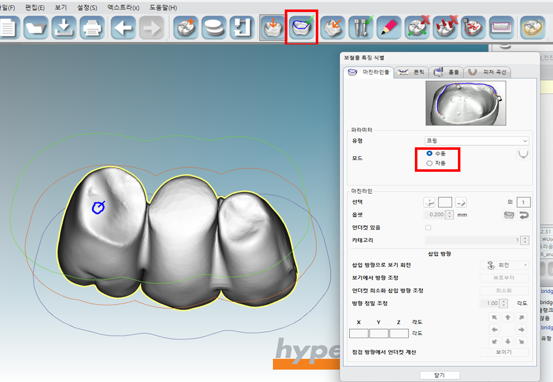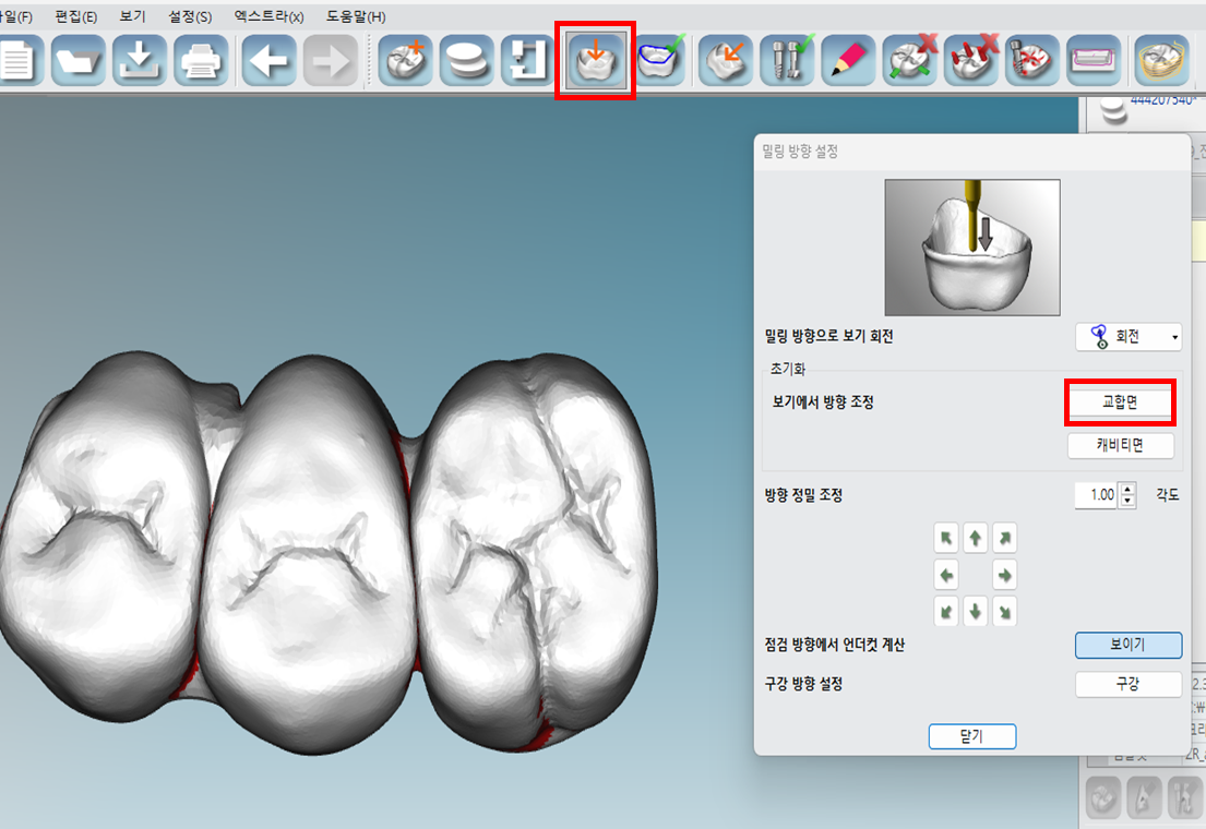 교합면이 보이게 지정한 후 표시한 교합면을 클릭하고 닫기를 누릅니다.