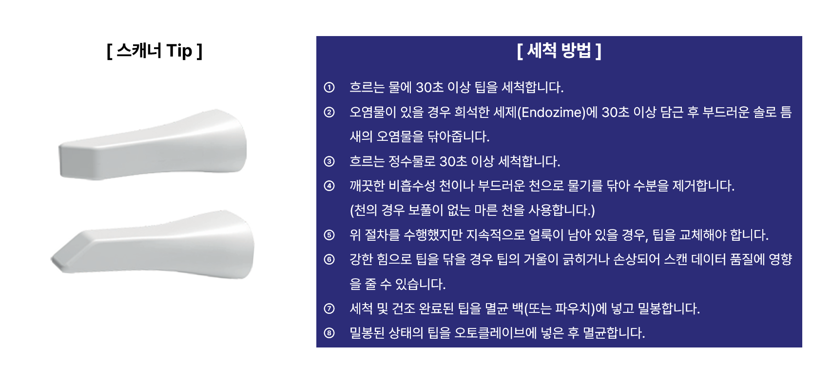 - 팁 내부 거울의 상태에 따라 스캔 데이터 품질에 큰 영향을 미칠 수 있으므로, 스캔 전 거울의 상태를 확인해야 합니다.