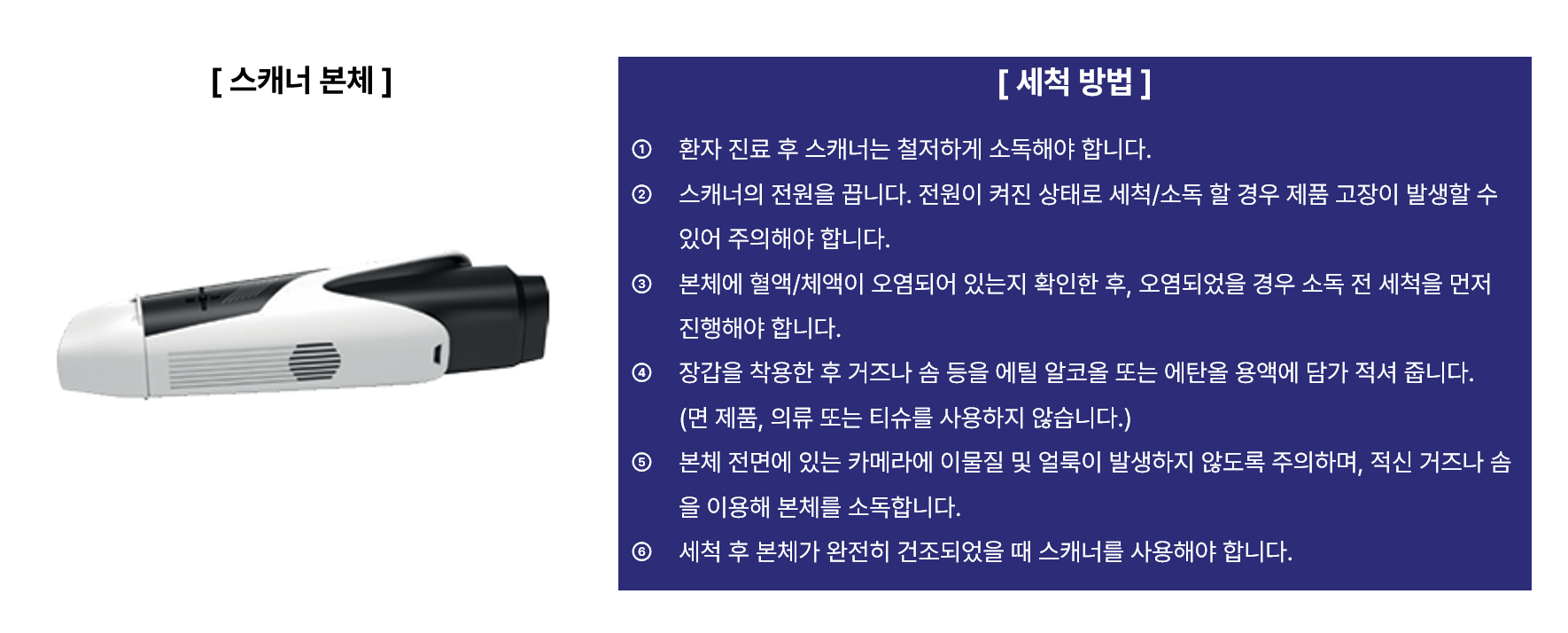 - 재사용을 위해 스캐너 처리에 사용되는 소독약 관련 내용은 SDS(안전 보건 자료)에서 제공하는 경고 및 개인 보호 지침을 읽고 따라야 합니다.