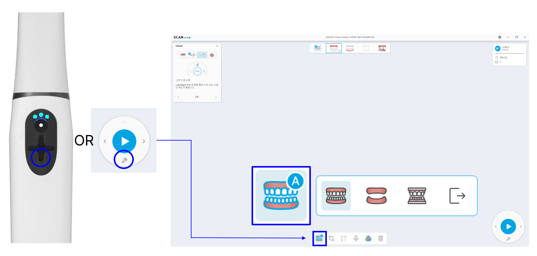 FREEDOM Air는 스캔 대상에 따라 [구강 / 무치악 / 모델]의 스캔 모드를 자동으로 전환합니다.