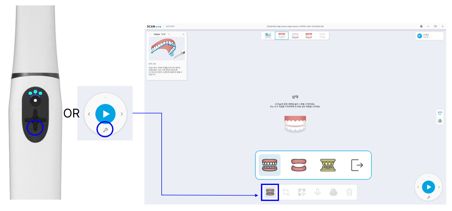 구강 스캔 전 환자의 구강 상태를 확인해야 합니다. 구강 내에 혈액/타액이 과도하게 있는 경우 스캔 데이터에 영향을 줄 수 있으므로 스캔 전 반드시 혈액과 타액을 제거해야 합니다.