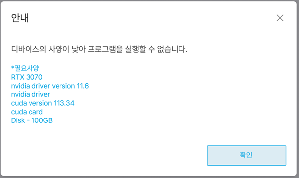 안내창의 * 필요 사양에 [ nvidia driver version 11.6 / nvidia driver / cuda version 113.34 / cuda card ]가 나온 경우 NVIDIA 그래픽 드라이버의 업데이트가 필요합니다.