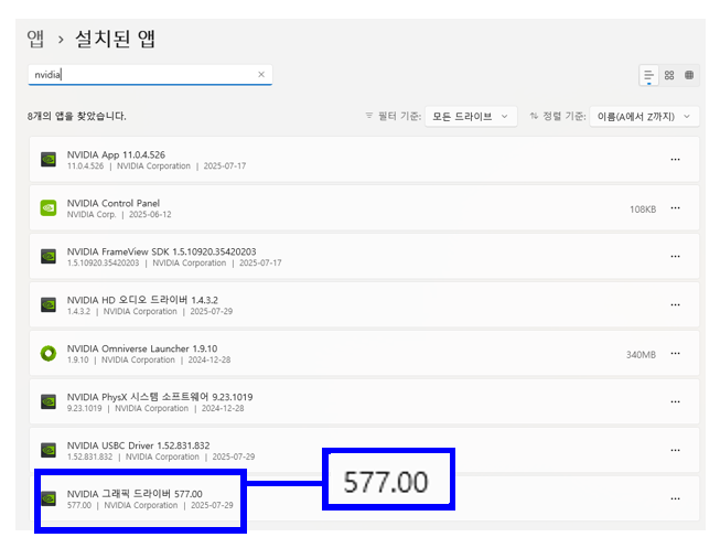 윈도우 설정 > 앱 > 설치된 앱 > NVIDIA 검색 > 버전 정보 확인