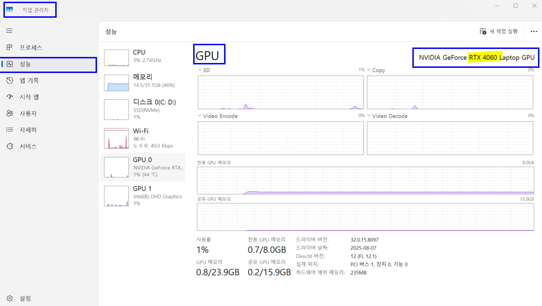 윈도우 작업 관리자 실행 > 성능 메뉴 진입 > GPU 사양 확인